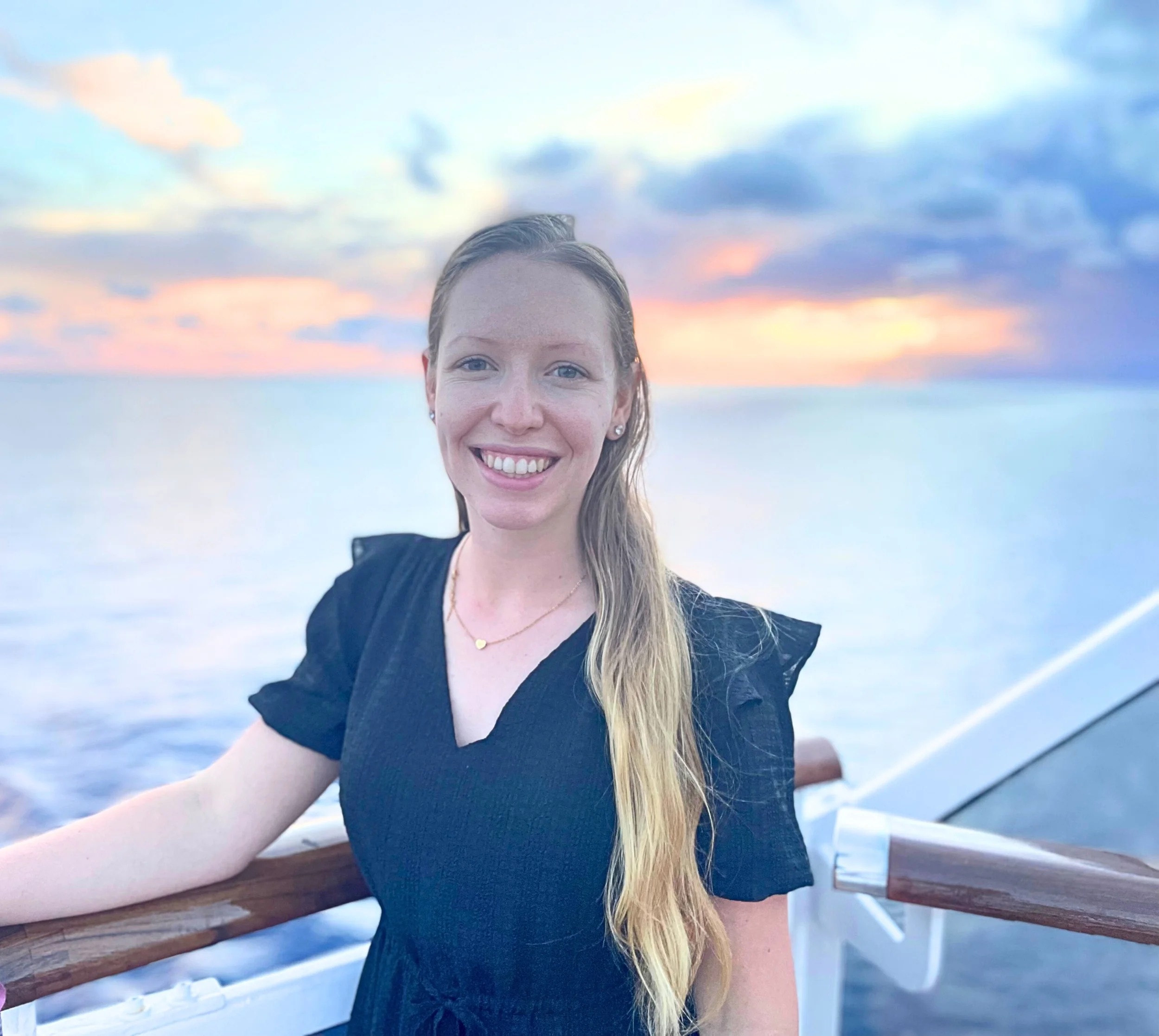 A woman with long blonde hair smiling on a boat with a sunset over the water in the background.